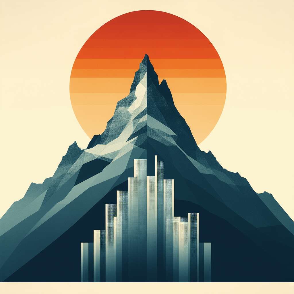 2. Mountain Range: Abstracted mountain range in the background, built from geometric forms. Use a limited palette of desaturated blues and grays. Highlight vertical lines to simulate mountain peaks.